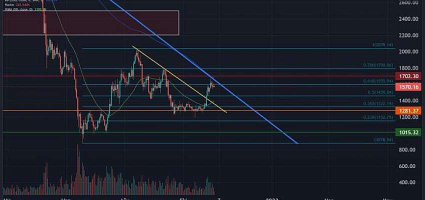 Bitcoin’e göre daha pozitif hareketlilik gösteren Ethereum, 25 Ekim’de minör düşen trendi (sarı çizgi) kırarak yukarı yönlü hareketle 15 civarında artış göstermişti. Şimdilik 1570 seviyelerinde fiyatlanan Ethereum, majör düşen trendi (mavi çizgi) test etmiş fakat ret almıştı.
