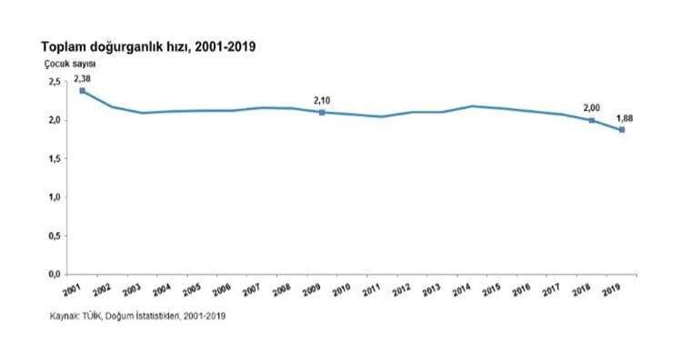 2019 yılında 1,88 oldu. Bu durum doğurganlığın, nüfusun yenilenme düzeyi olan 2,10'un altında