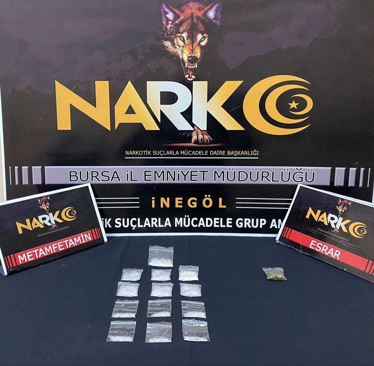 Bursa’nın İnegöl ilçesinde uyuşturucu madde ticareti yaptığı tespit edilen 7 şahıs gözaltına alınırken, 4’ü tutuklandı.Emniyet Müdürlüğü Narkotik Suçlarla Mücadele Büro Amirliği ekiplerince çeşitli adreslere operasyon düzenledi. Operasyonlarda bir miktar uyuşturucu madde ele geçirildi. Madde ticareti yaptığı tespit edilen 7 kişiden 4’ü çıkarıldığı mahkemece tutuklanarak cezaevine gönderildi. Yakalanan şahıslar üzerinde ve evlerinde yapılan aramada; Davut Ç.(35)’ye ait satışa hazır vaziyette toplamda 41,75 gram metamfetamin, 3 gram esrar, Erol Ç. (36), Sevim T. (43) ve Rıdvan A. (31) isimli şahısların ikametinde yapılan aramalarda ise 70 gram satışa hazır metanfetamin, 1 adet hassa terazi, paketlemede kullanılan poşetler, uyuşturucu satışından elde edildiği değerlendirilen bin 510 lira para ele geçirildi.Alpay E., Mehmet G. ve Erkan A. isimli şahısların üzerinde ise ruhsatsız tabanca ele geçirildi.Yakalanan şahıslardan Davut Ç., Erol Ç., Sevim T. ve Rıdvan A. çıkartıldığı mahkemece tutuklanarak cezaevine gönderildi.