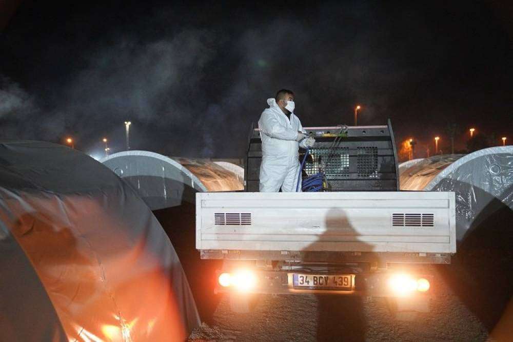 İSTANBUL (İGFA) - İstanbul Beylikdüzü Belediyesi’nin Hatay İskenderun’da 70 dönümlük bir alanda kurduğu çadır kentte olası salgın hastalıklara karşı ilaçlama ve dezenfeksiyon çalışmaları başladı. Veteriner İşleri Müdürlüğü ekiplerince ortak kullanım alanları, tuvalet, duş ve çadırlar başta olmak üzere tüm alan ilaçlanarak dezenfekte ediliyor.