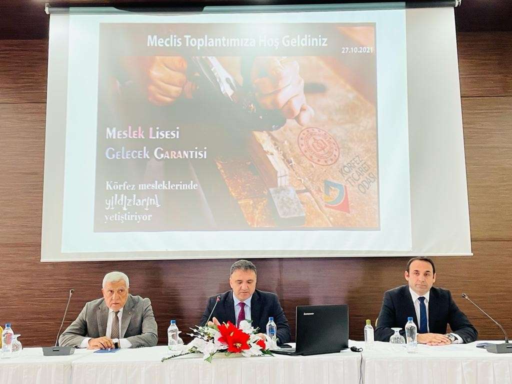 Körfez Ticaret Odası Ekim meclis toplantısı, saygı duruşu ve İstiklal Marşı’nın okunmasının ardından başladı. Ayhan, oda üyelerinin Cumhuriyet Bayramını kutladı. Körfez Ticaret Odası meclis toplantısında faaliyetleri aktaran Yönetim Kurulu Başkanı Recep Öztürk, "Meslek Lisesi Gelecek Garantisi projemizin sonucu olarak pilot okulumuz Körfez MTAL’i MEB ile TOBB arasında imzalanan protokol okulları arasına alarak, okulumuzun koordinasyonundan sorumlu hale geldik, böylece sektörümüzün ihtiyaçlarına göre okulumuzun iş ve işlemlerini dizayn ederek iş arayan değil, aranan mezunlar üreteceğiz ve mesleki eğitim için var gücümüzle çalışacağız" dedi.