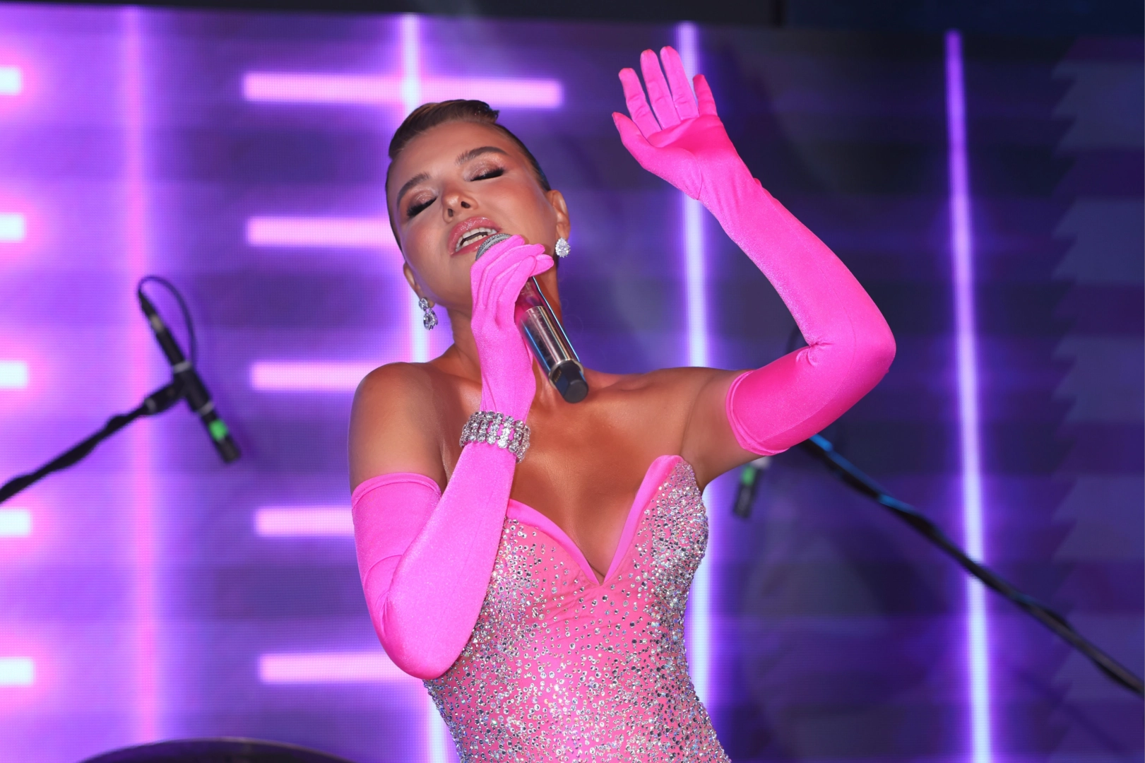 Seyircilerin “Barbie Bebek” tezahüratlarıyla alkış yağmuruna tuttuğu Gülben Ergen, özenli şıklığı ve ışıldayan güzelliğiyle göz kamaştırdı.