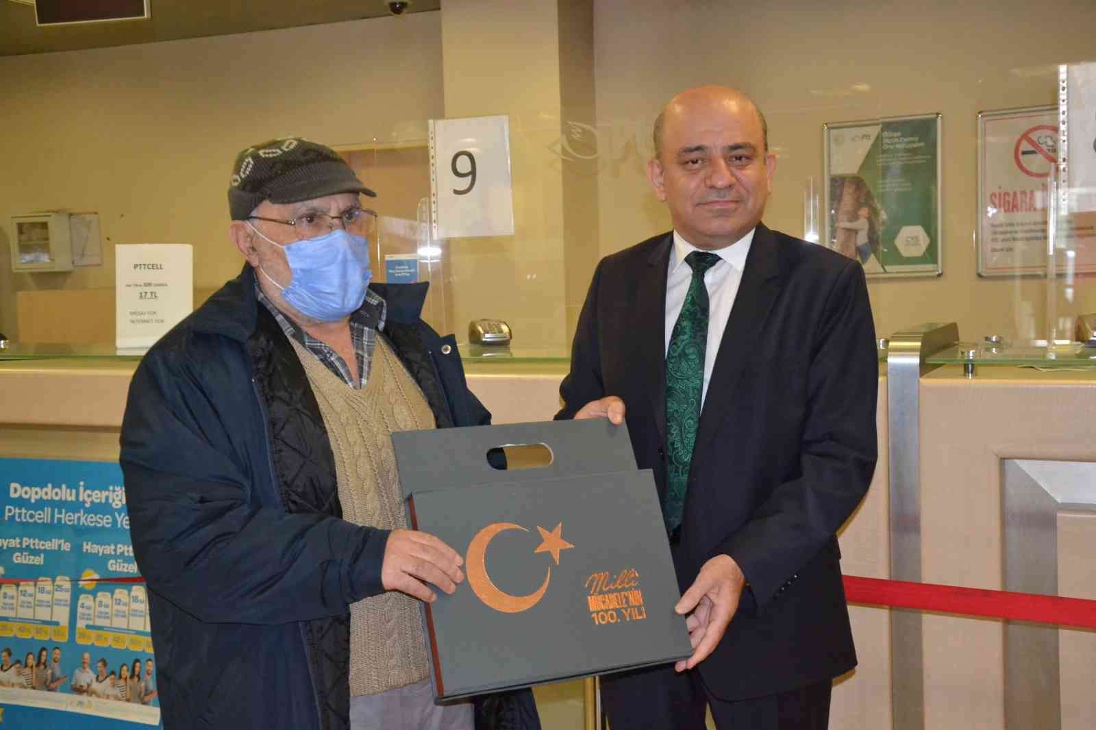 SGK prim ücretini yatırmak için merkez şubesine gelerek PTT’nin kuruluş yıl dönümüyle aynı rakamları taşıyan 181 numaralı gişe numarasını alan Basri Tekin’e’e PTT Başmüdürü Suat Öztürk tarafından Milli Mücadelenin 100. yılı anısına basılan anma pulu serisi olan bir albüm hediye edildi. PTT Başmüdürü Suat Öztürk kuruluşunun 181 yılı anısına pasta keserek personel ve müşterilere ikramda bulundu.