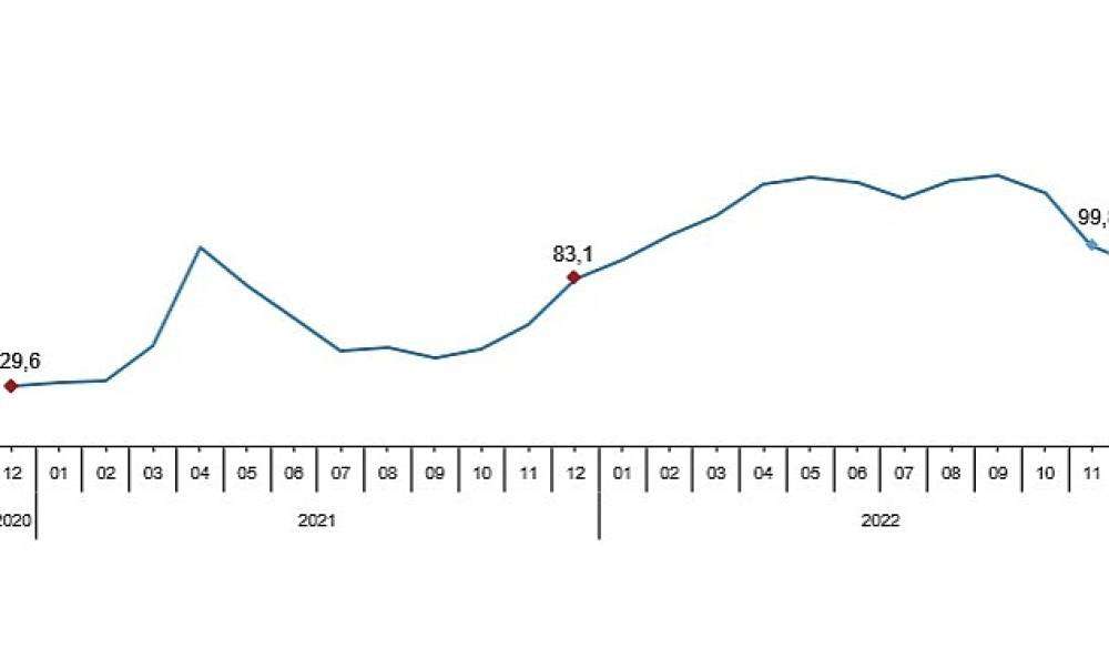 Sanayi, inşaat, ticaret ve hizmet sektörleri toplamında ciro endeksi (2015=100), 2022 yılı Aralık ayında yıllık %89,7 arttı.